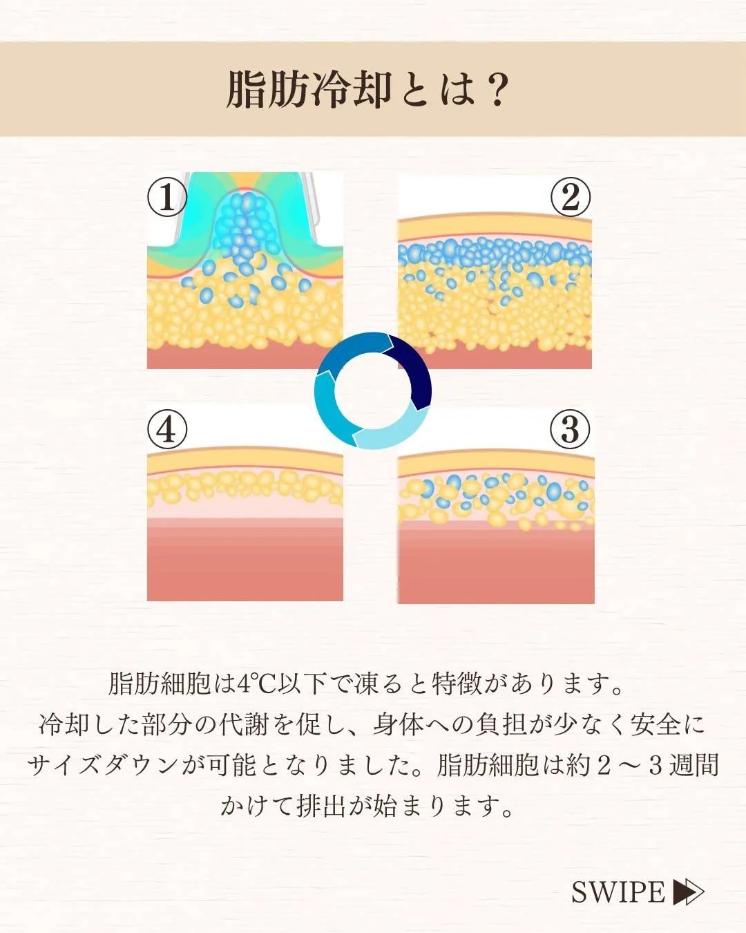 脂肪冷却マシンは、気になる部位に冷却シリコンヘッド当て-4度の温度で脂肪を凍らせ老廃物として体外に出す。